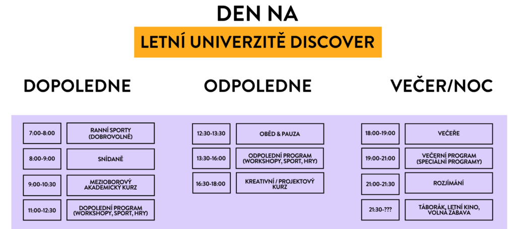 Letní univerzita Discover je prázdninový program pro studující prvních 3 ročníků vysokých škol a lidi v jejich věku zaměřený na mezioborový a kreativní přístup ke vzdělávání a na osobní rozvoj. Strávíš několik dní v komunitě aktivních a otevřených lidí, kteří chtějí být tou nejlepší verzí sebe sama. Na programu jsou kurzy a workshopy, sportovní a kreativní aktivity, diskuze o duševním zdraví i hry.