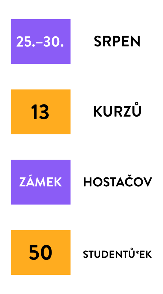 - Good vibes na zámku. Letní univerzita se odehrává v krásném prostředí zámku Hostačov na Vysočině, který budeme mít celý pro sebe.